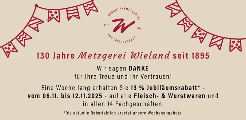 Wenn Sie auf der Suche nach Ihrem persönlichen, regionalen Metzger sind und wissen wollen, wo das Fleisch auf Ihrem Teller herkommt, dann sind Sie hier bei uns genau richtig. Seit fast 130 Jahren steht die Metzgerei Wieland für hochwertige Fleisch- und Wursterzeugnisse sowie traditionelle Handwerkskunst. Wir vereinen alte Werte mit modernster Technologie. So garantieren wir Ihnen die beste Fleisch- und Wurstqualität und den höchsten Genuss.