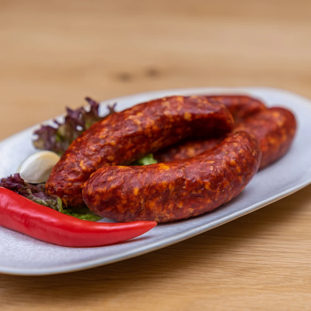 | Unsere gerauchten Paprikawürste, geräuchert über Buchenholz im Naturdarm, verfeinert mit einer pikanten Paprikanote. Ideal für jedes klassische Vesper zum kalt und warm Genießen. |